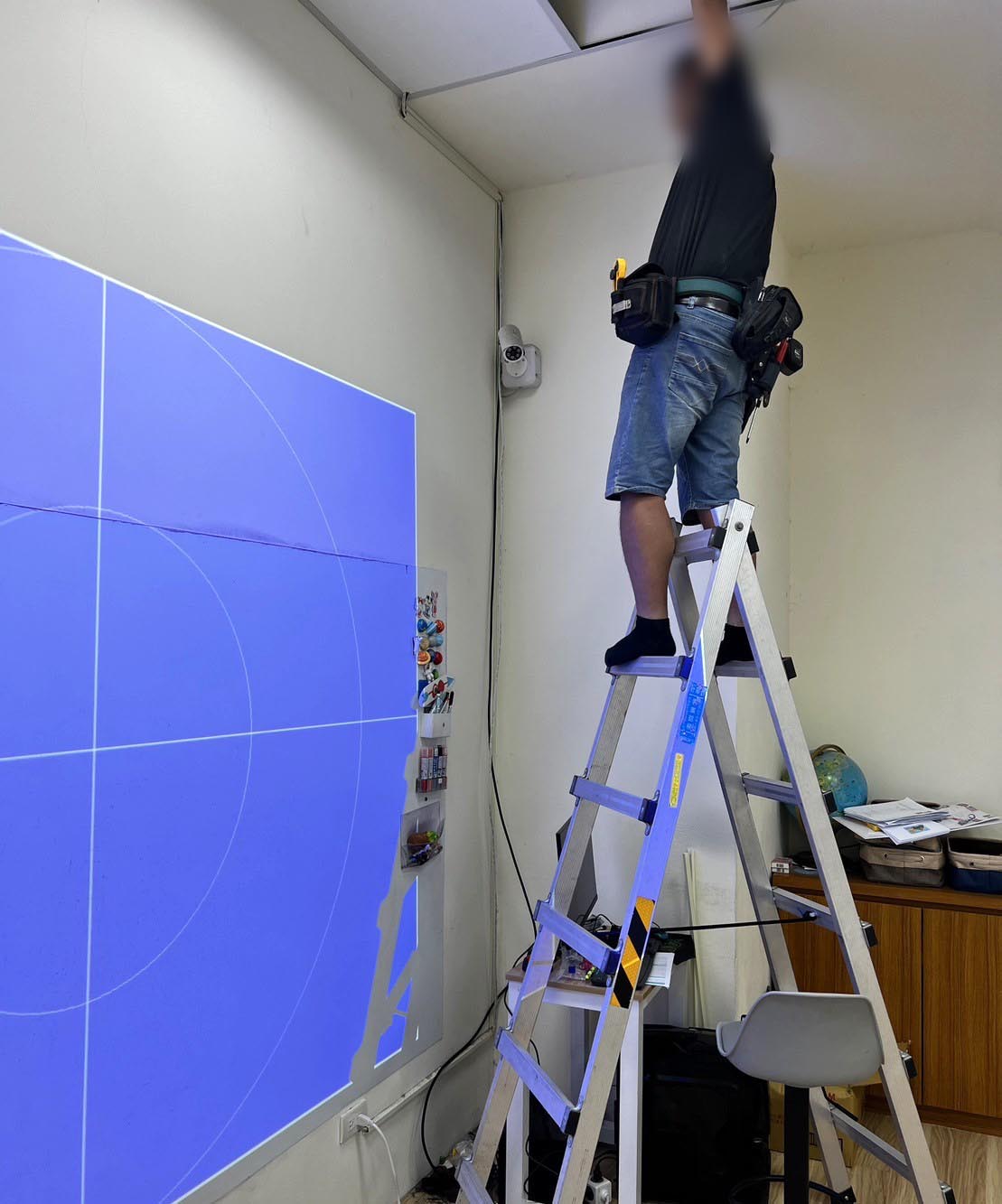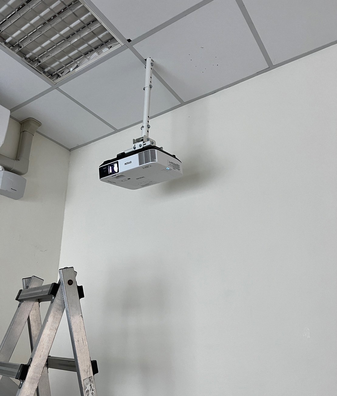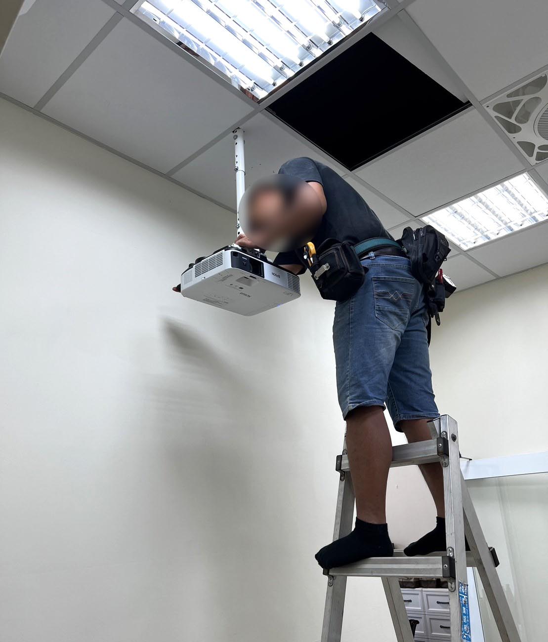 20230720 美語補習班 替換投影機+重新安裝舊的投影機故障與投影效果不佳,採購新投影機並重新安裝,原本舊機安裝的角度錯誤導致過度仰賴梯形修正,且吊架沒有確實補強安裝會有晃動情況~安裝新投影機時一併將問題解決。