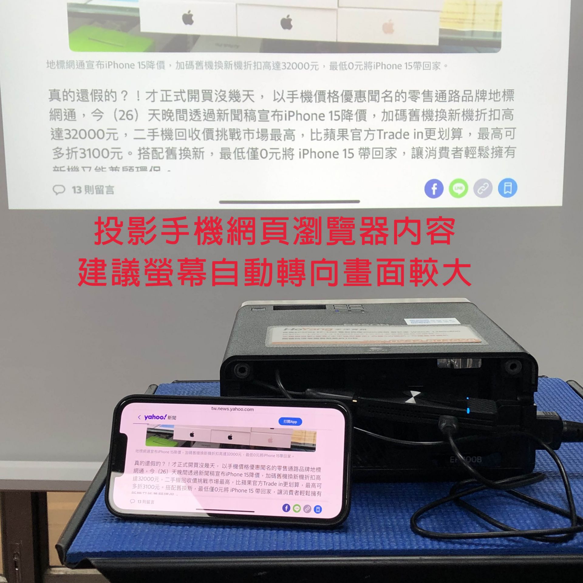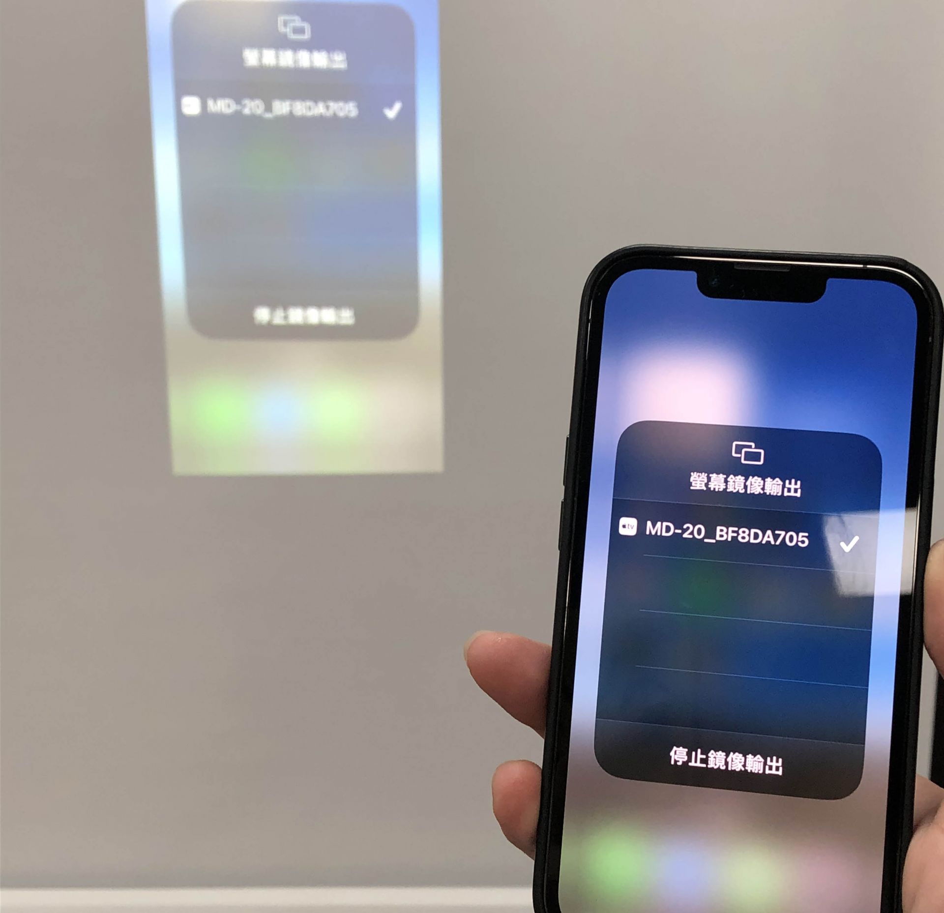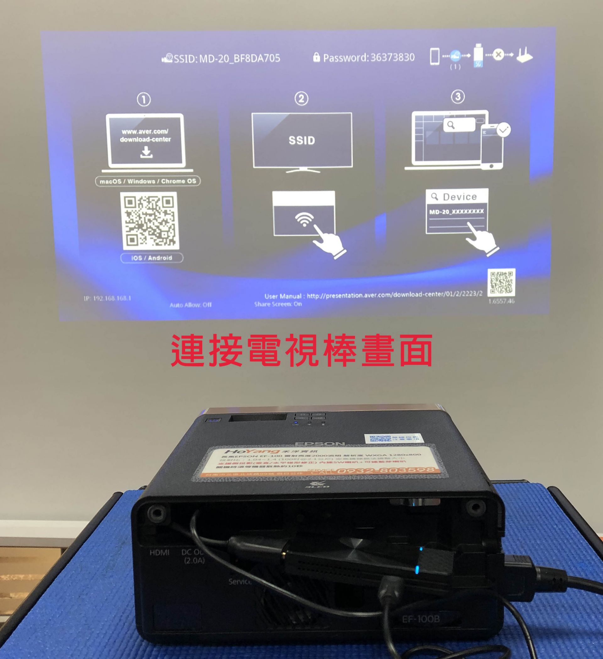 20230927 IPHONE 13蘋果手機無線投影示範操作 Airplay 螢幕鏡像輸出示範設備:Iphone 13 與 AVER MD-20無線影音傳輸器 與EPSON EF-100投影機特別提醒:鏡像輸出=畫面同步,無線投影棒本身沒有網路功能~手機如須上網需使用手機本身的4G網路喔。